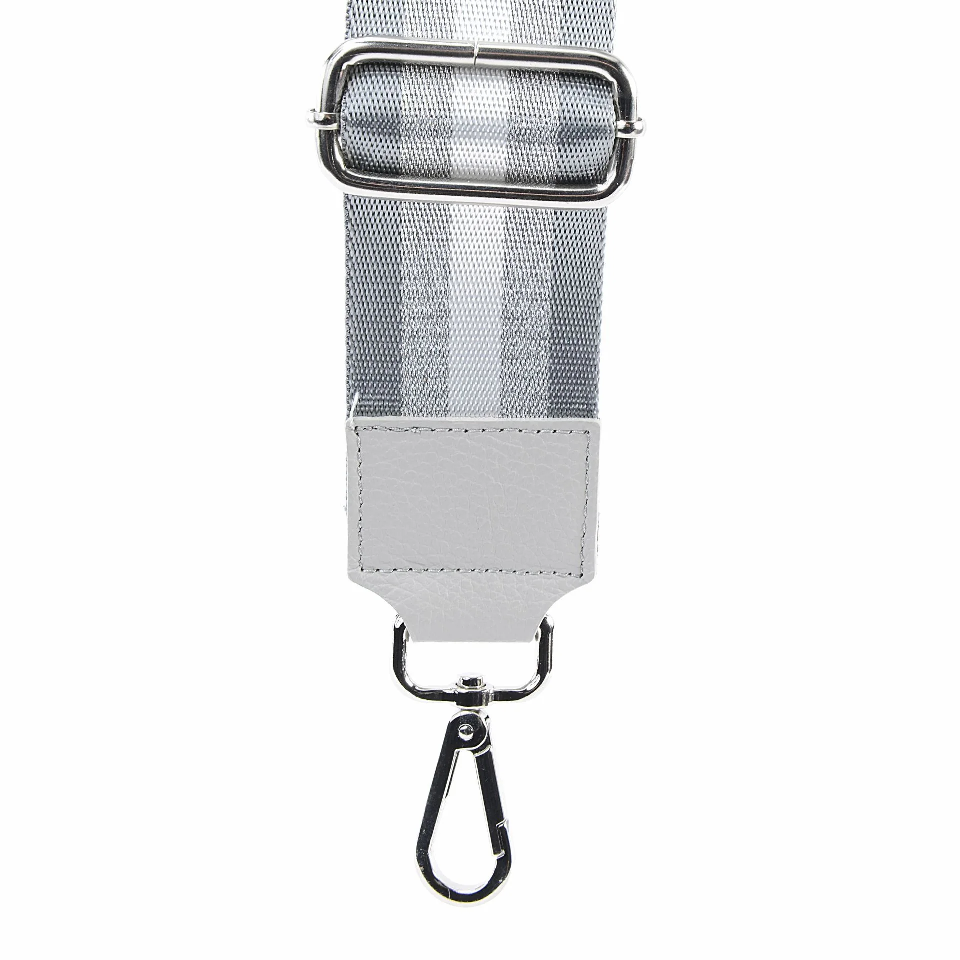 Bandoulière amovible et réglable en sangle synthétique à motifs rayés argentés avec embout en cuir, ferrures argentées.