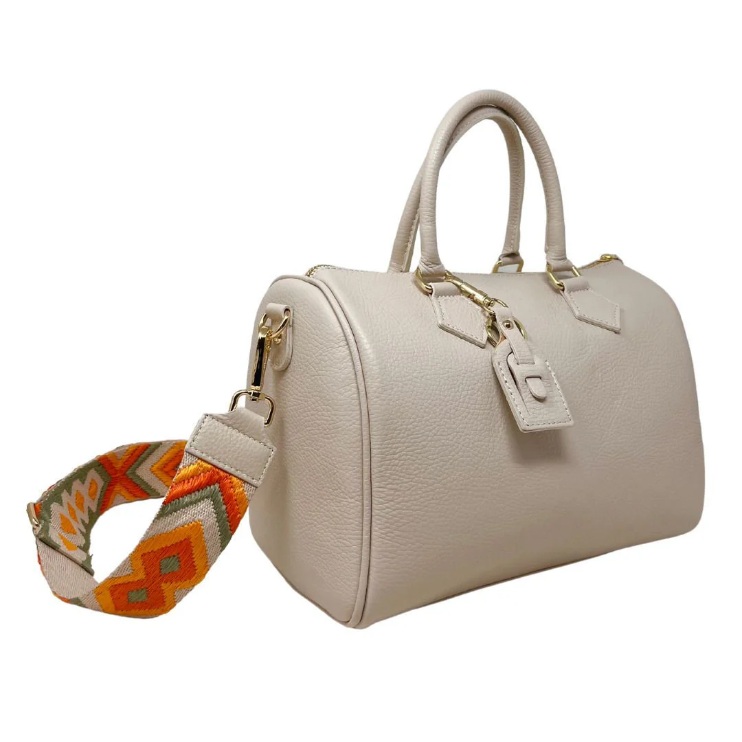 Belle contenance pour ce sac bowling pour femme en cuir grainé, facile à vivre ! Sa bandoulière n'est pas réglable, mais vous pourrez revisiter son élégance classique en l'équipant avec une de nos bandoulières à motifs (assorties, détails dorés). On aime son porte-clés coordonné offert, et la possibilité de le personnaliser selon son style avec une bandoulière sangle amovible !