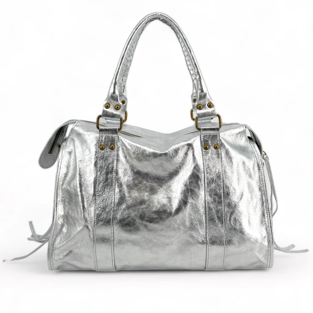 Sac Ă main en cuir mĂ©tallisĂ© argent clair, portĂ© main, Ă©paule ou bandoulière, fabriquĂ© en Italie.Â