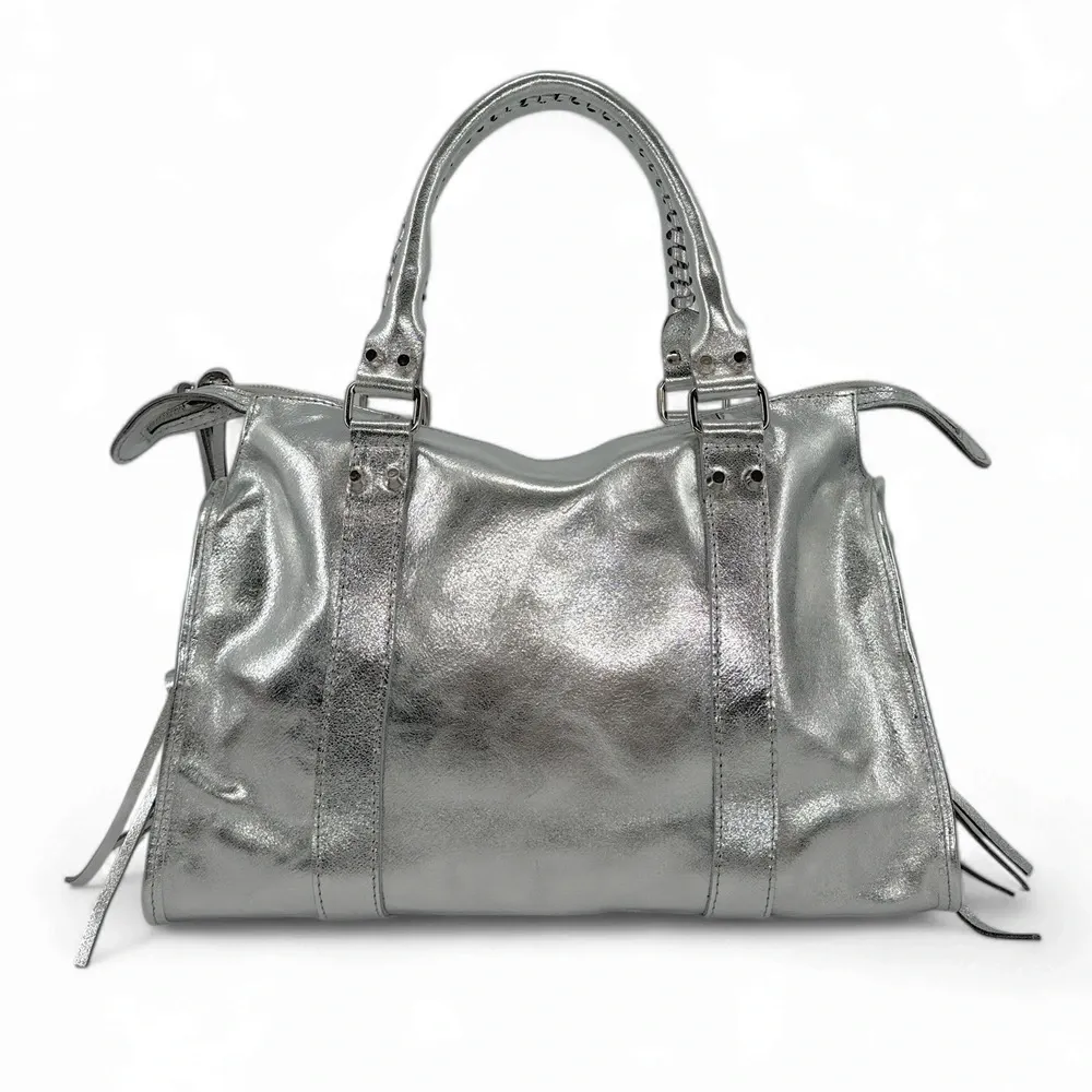 Sac Ă main en cuir mĂ©tallisĂ© argent moyen, portĂ© main, Ă©paule ou bandoulière, fabriquĂ© en Italie.Â