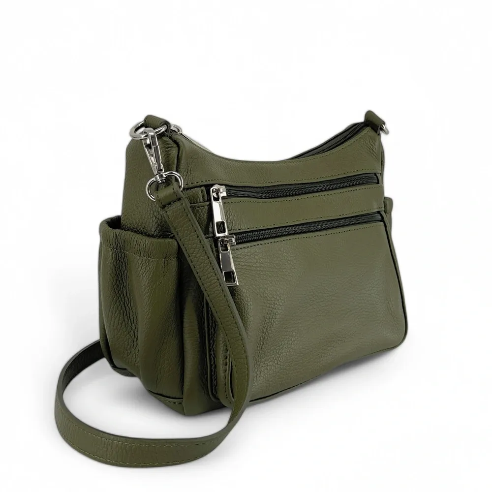 Sac à main besace multipoches en cuir grainé, porté bandoulière, fabriqué en Italie.