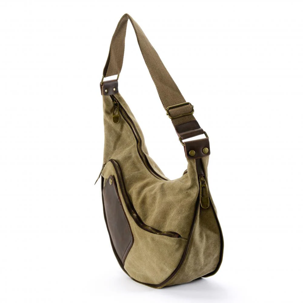Sac besace holster à bandoulière réglable en toile et cuir, porté poitrine, dos ou crossbody.