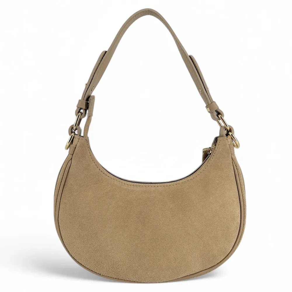 Sac à main demi lune bi-matière en cuir nubuck et détails en cuir grainé, porté coude, épaule ou bandoulière, fabriqué en Italie.