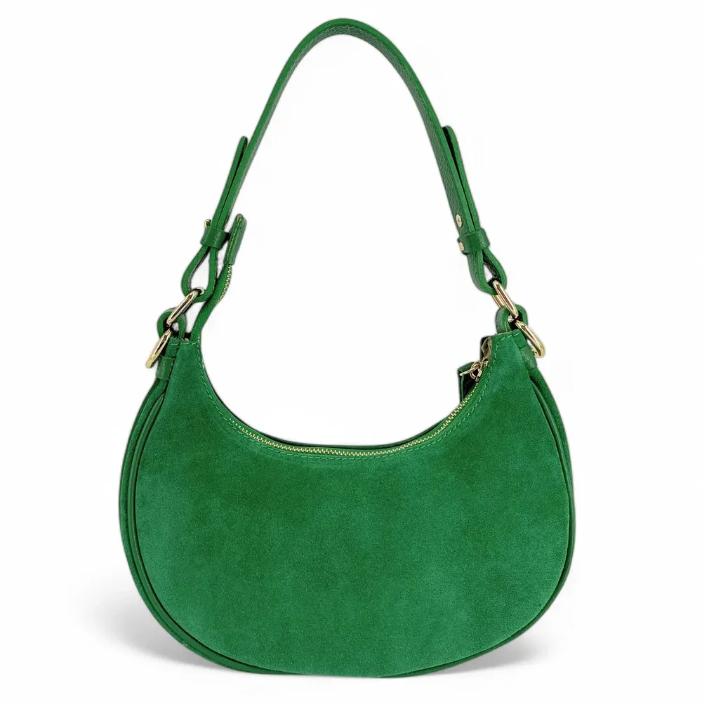 Sac à main demi lune bi-matière en cuir nubuck et détails en cuir grainé, porté coude, épaule ou bandoulière, fabriqué en Italie.
