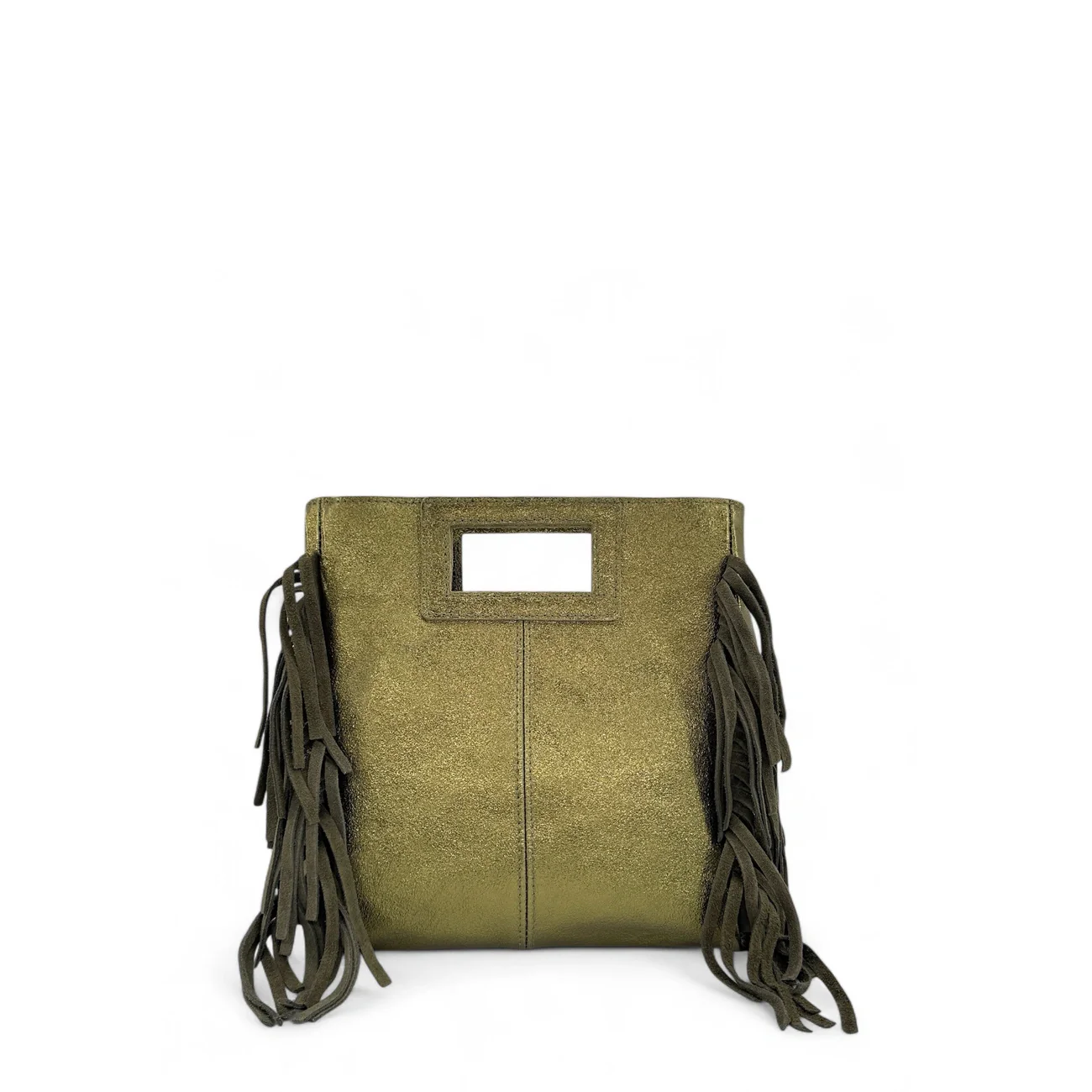 Sac à main à franges en cuir métallisé et daim, porté main ou bandoulière, fabriqué en Italie.