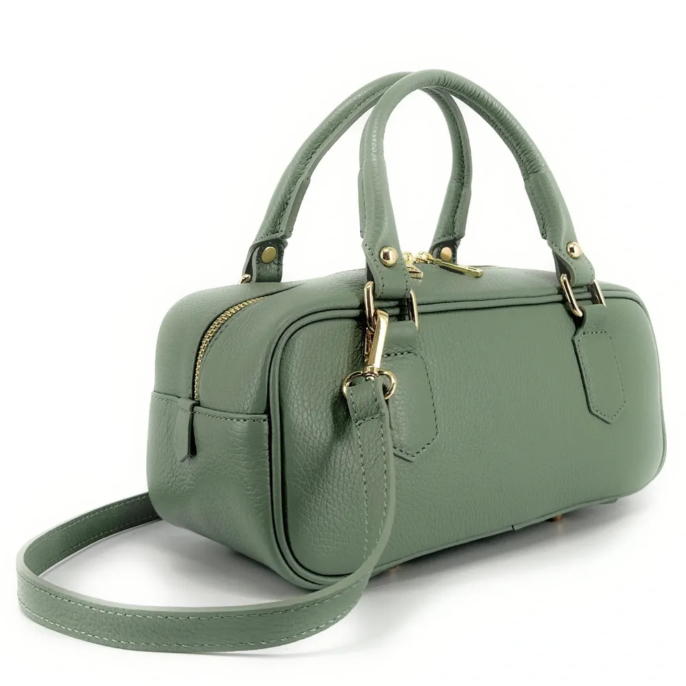 Sac à main de type bowling rectangulaire en cuir grainé, porté main ou bandoulière, fabriqué en Italie.