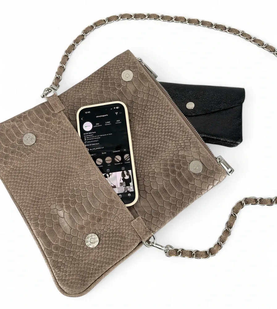 Sac pochette en cuir embossĂ© python taupe, portĂ© bandoulière chaĂ®ne et cuir, fabriquĂ© en Italie.Â