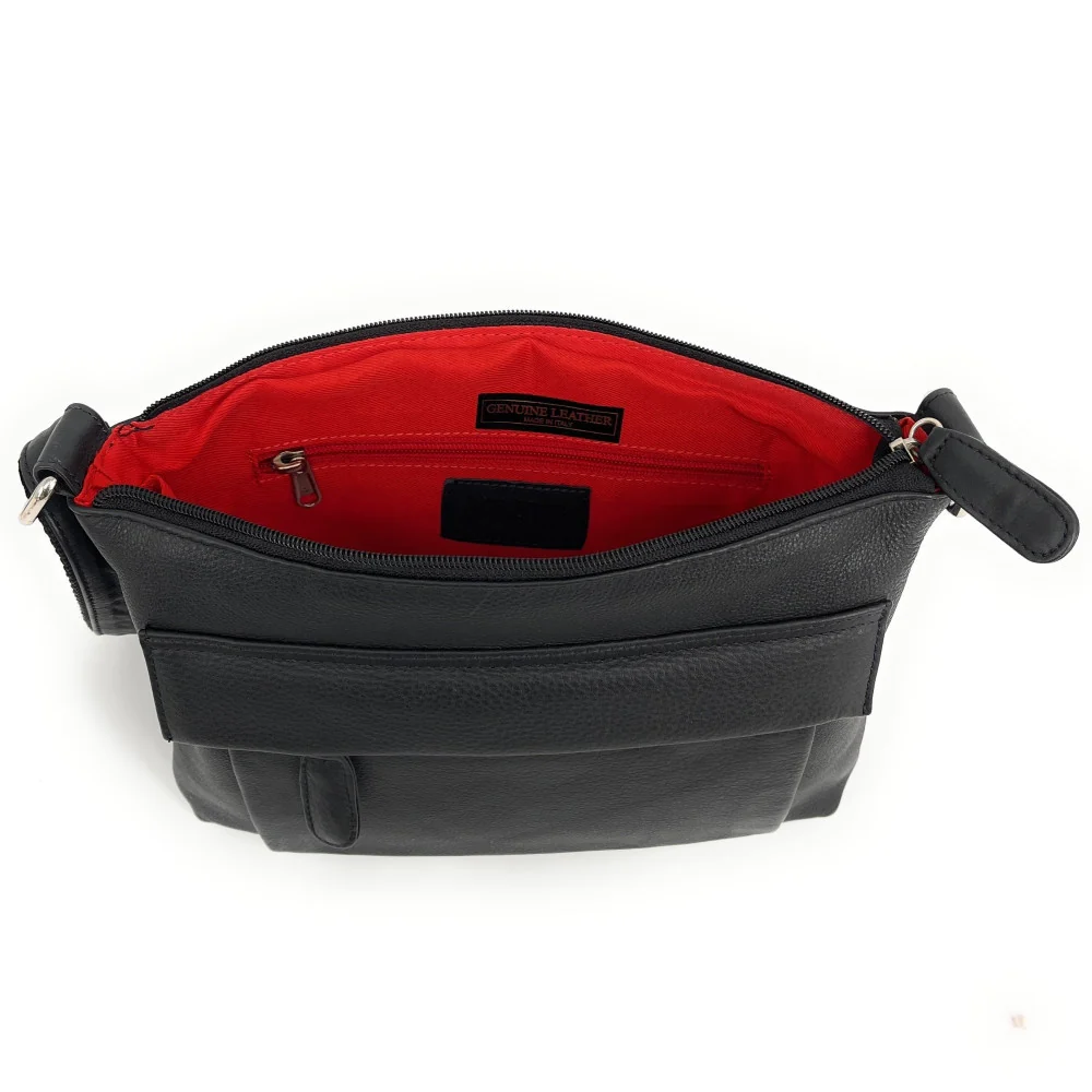 Sacoche à bandoulière en cuir lisse, porté épaule ou croisé, fabriqué en Italie.